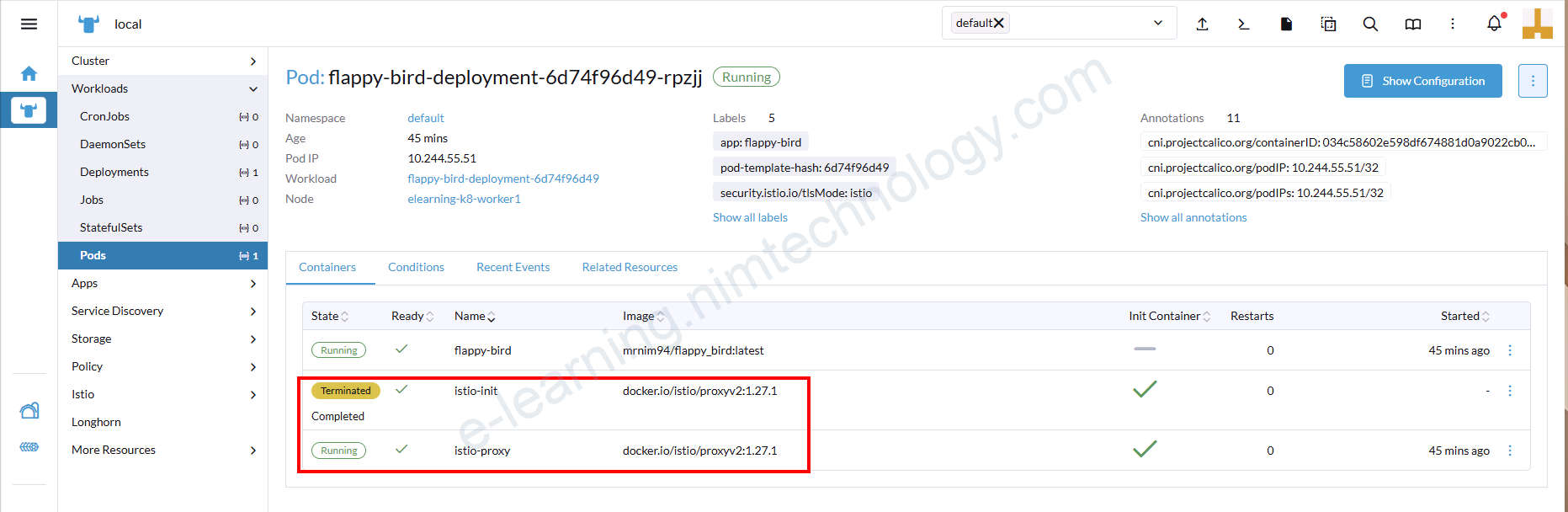 Sau khi add annotation xong thì bạn kiểm tra pod thấy các container của Istio Sidecar là ok: